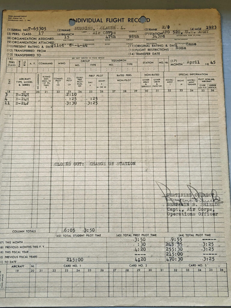 Flight log for Claude L. Burriss, April 1945, Burriss family photo